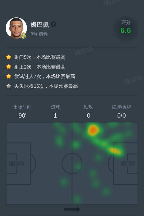 整个比赛中,姆巴佩展现出了超凡的个人技术,他频繁突破对手防线,制造威胁,展现了不俗的射门能力和过人技术。在场上,他的表现活跃且全面,既能为球队进攻提供威胁,又在防守端努力争抢和拦截,展现了全面的球员素质。